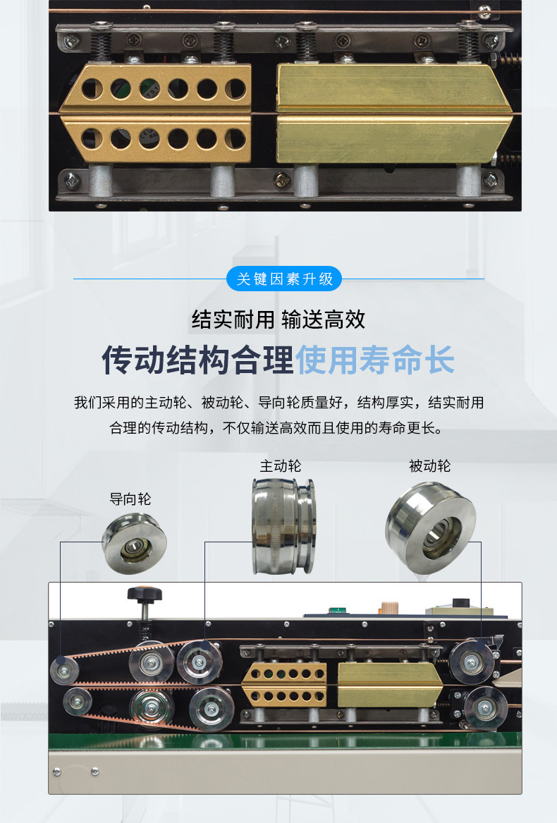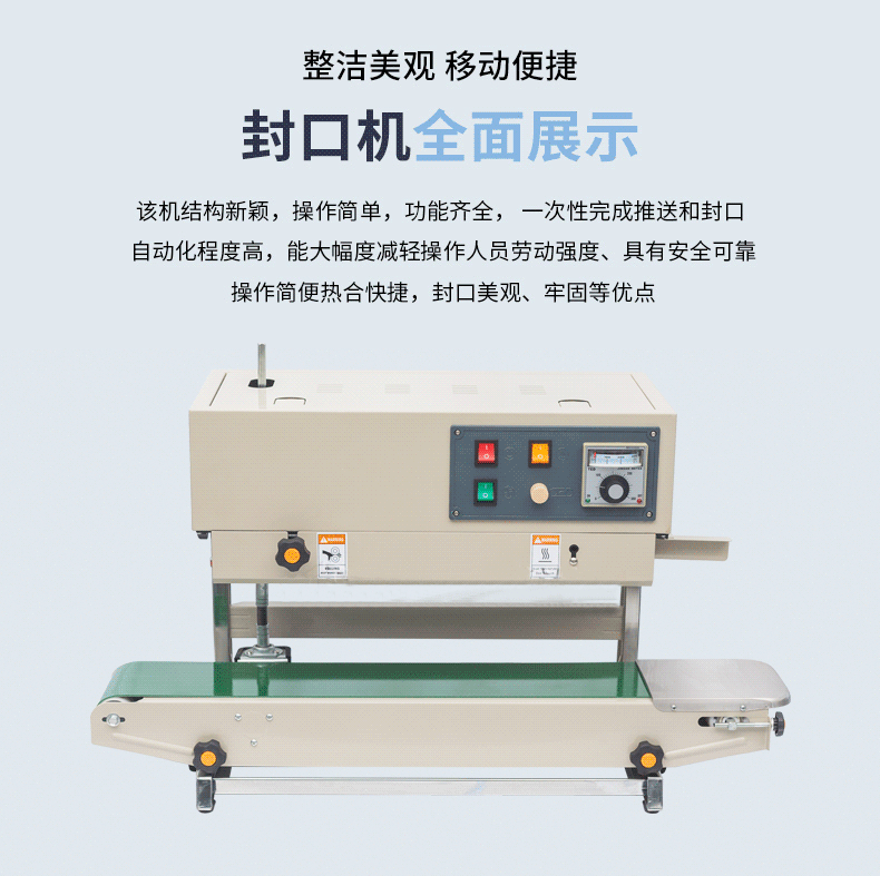 連續式封口機通過加熱元件對包裝材料進行加熱,使其達到熔融狀態,然后在壓力作用下將包裝材料密封在一起。設備通常采用輸送帶或鏈條等連續輸送裝置,將待封口的物品連續地輸送通過封口區域,實現連續封口操作。