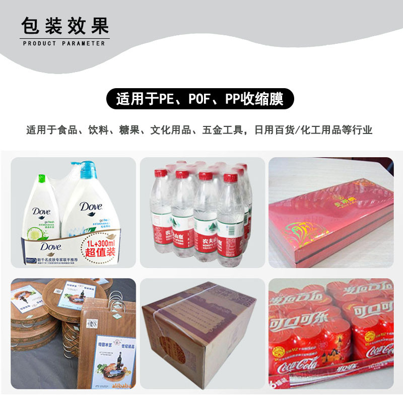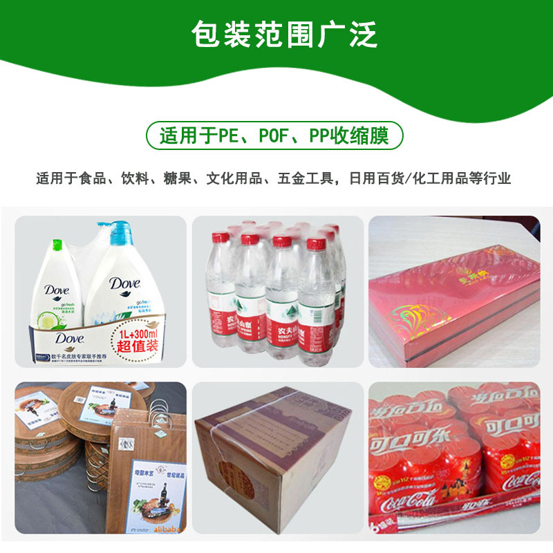 適用于食品、飲料、醫藥、音像制品、五金、化妝品、書籍、玩具、塑膠、電子等產品的外包裝及組合收縮包裝 。