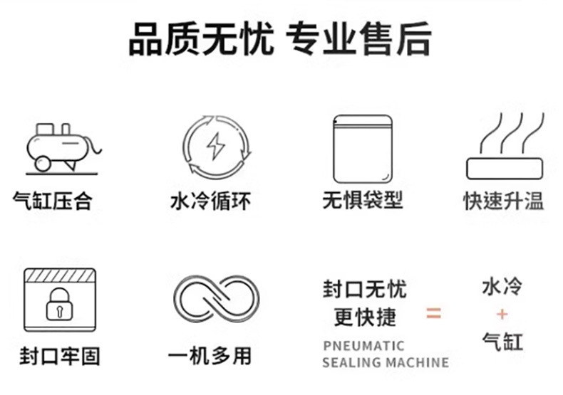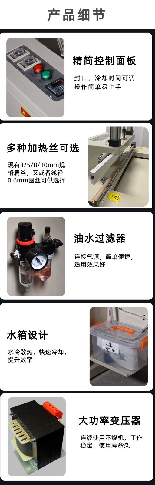 - 封口質量好:水冷技術可快速帶走熱量,使封口部位迅速冷卻固化,封口更牢固、平整,密封性好,能有效防止包裝內容物泄漏、變質。