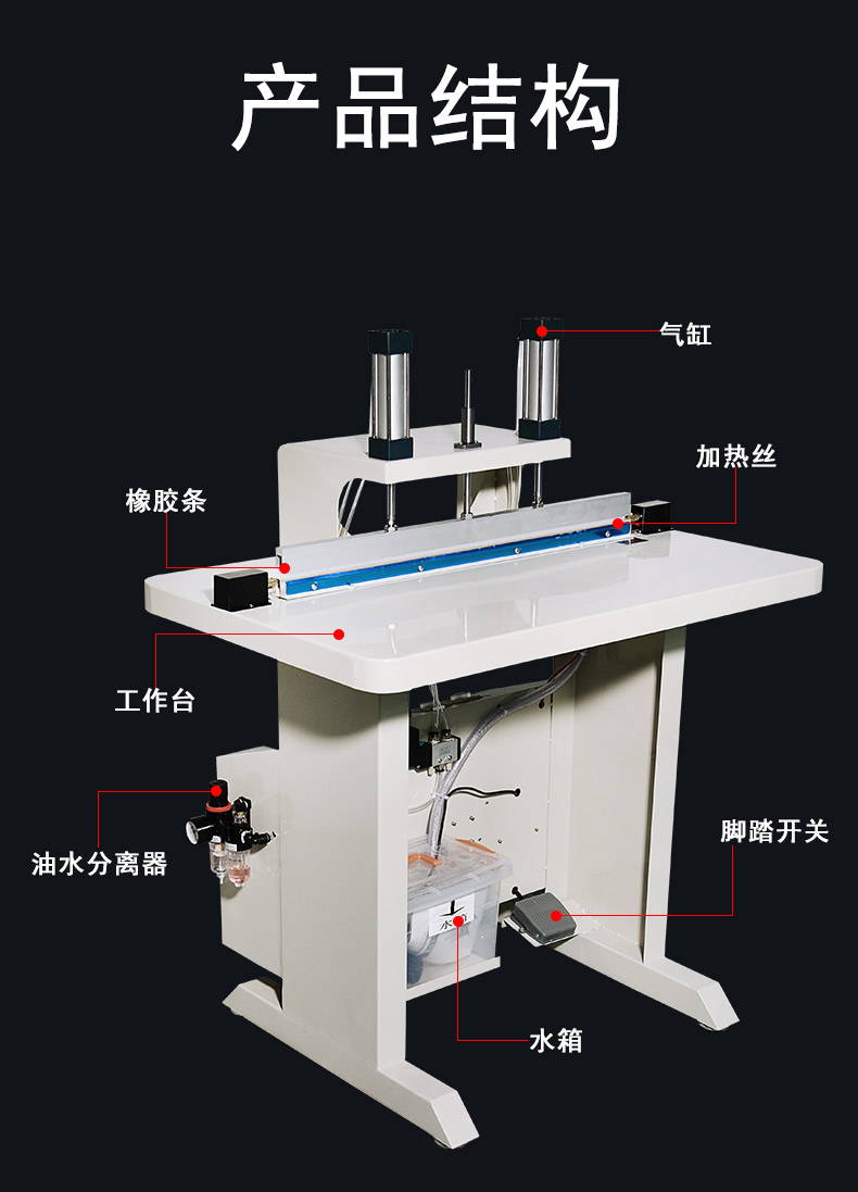 • 氣動水冷封口機:采用氣動系統作為動力源,通過壓縮空氣驅動氣缸帶動壓板進行封口操作。這種動力方式能夠提供較為穩定且較大的壓力,保證封口時壓板對包裝材料的壓合力度均勻一致。