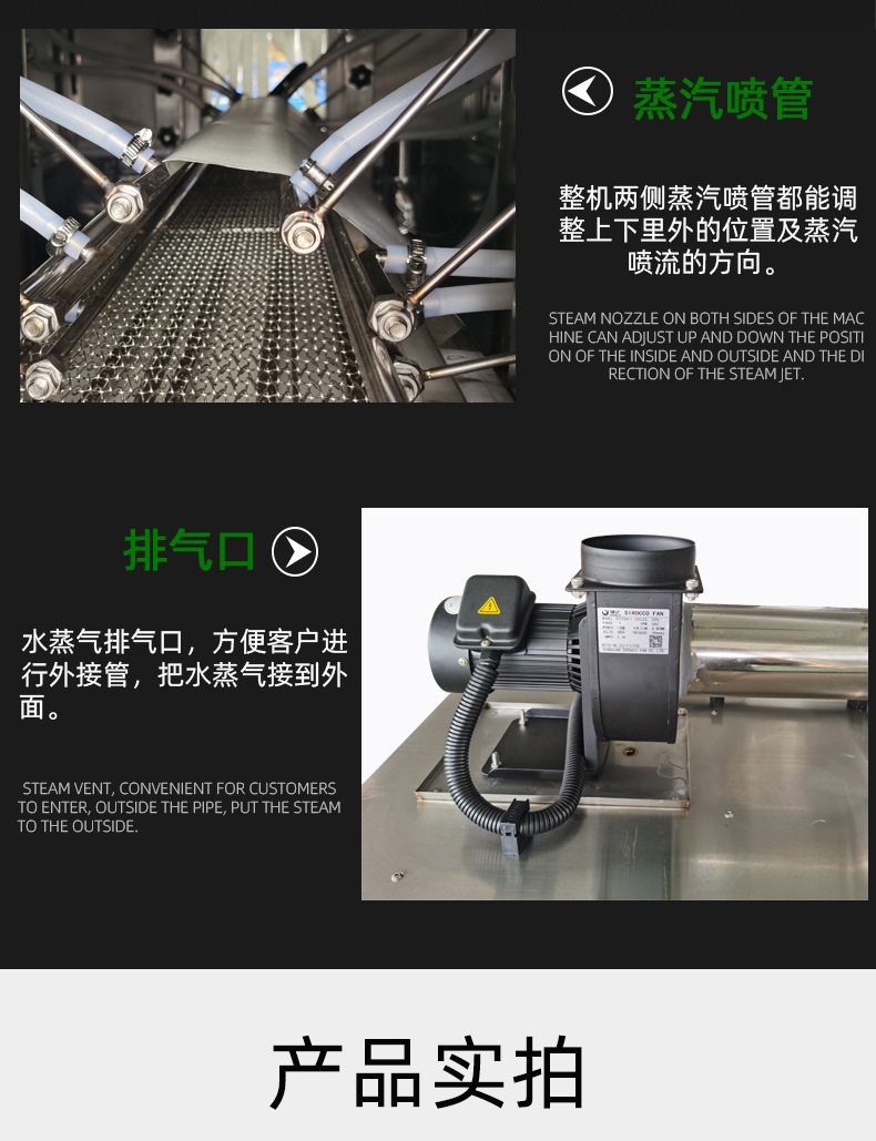 - 收縮效果好:蒸汽能夠全方位地接觸熱收縮膜,使薄膜各個部位受熱均勻,收縮效果一致,能夠緊密貼合產品表面,無論是規則形狀還是不規則形狀的產品,都能達到理想的包裝效果,提升產品的外觀品質。