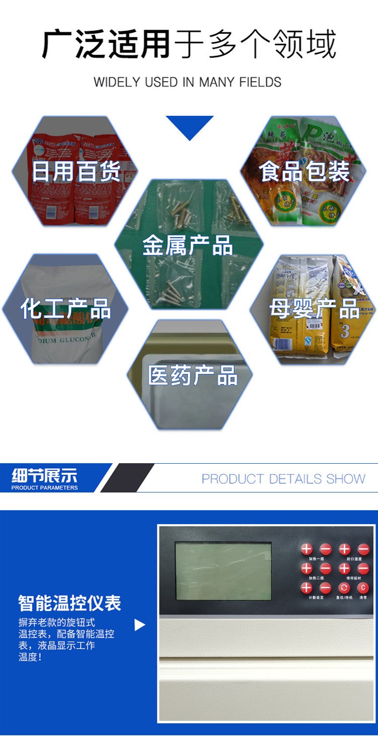 真空封口機主要用于食品包裝,例如各種食品、肉制品、海產品、果蔬、醬菜、干鮮果品、茶葉、糧食、生熟肉類等等,可以預防食品腐爛,起到保鮮、保質、防潮、防霉、防氧化以及真空滅菌的作用,